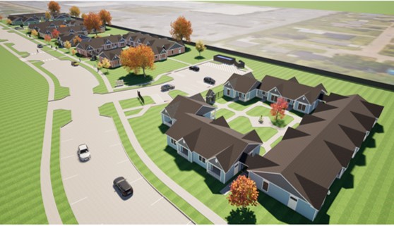 The concept consists of 44 affordable, one-bedroom units for low-income seniors, configured in four courtyard style, single-story structures on an approximately 5-acreparcel. This phase will be served by its own Community Center and will connect through a series of parklands and secure walkways throughout the entire 40-acre site.